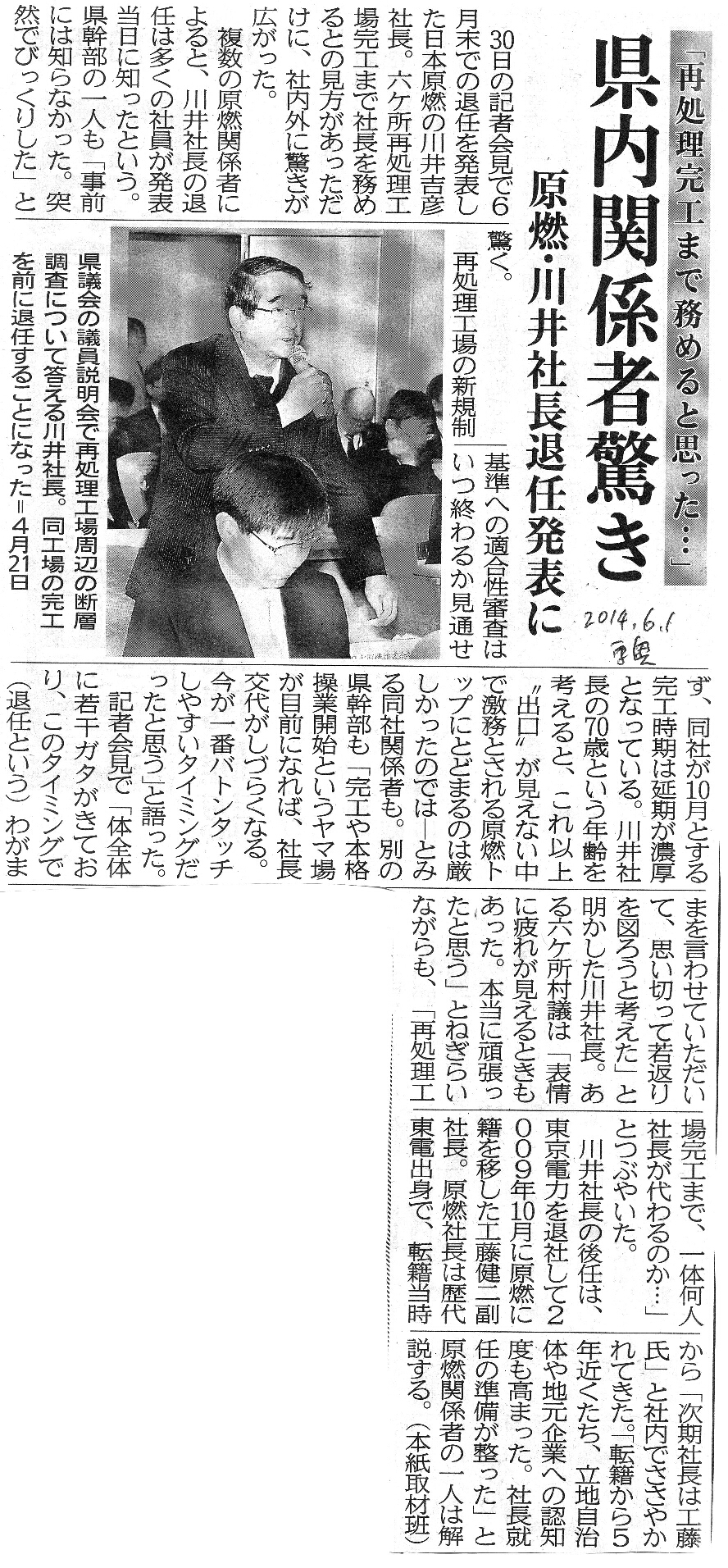 | [2014_06_01_02]再処理完了まで務めると思った… 県内関係者驚き 原燃・川井社長退任発表に(東奥日報2014年6月1日) |