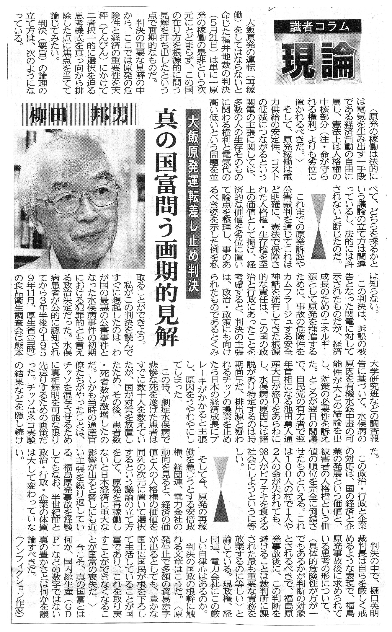 [2014_06_06_01]識者コラム 現論 大飯原発運転差し止め判決 真の国富問う画期的見解 柳田邦男(東奥日報2014年6月6日)