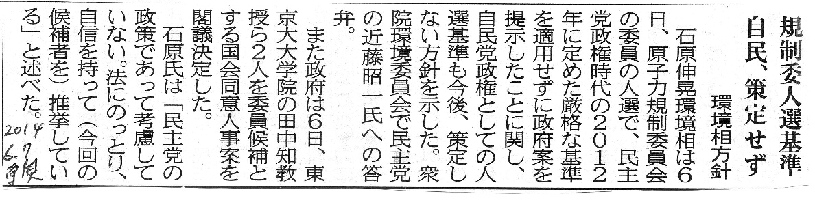 [2014_06_07_02]規制委人選基準 自民、策定せず 環境相方針(東奥日報2014年6月7日)