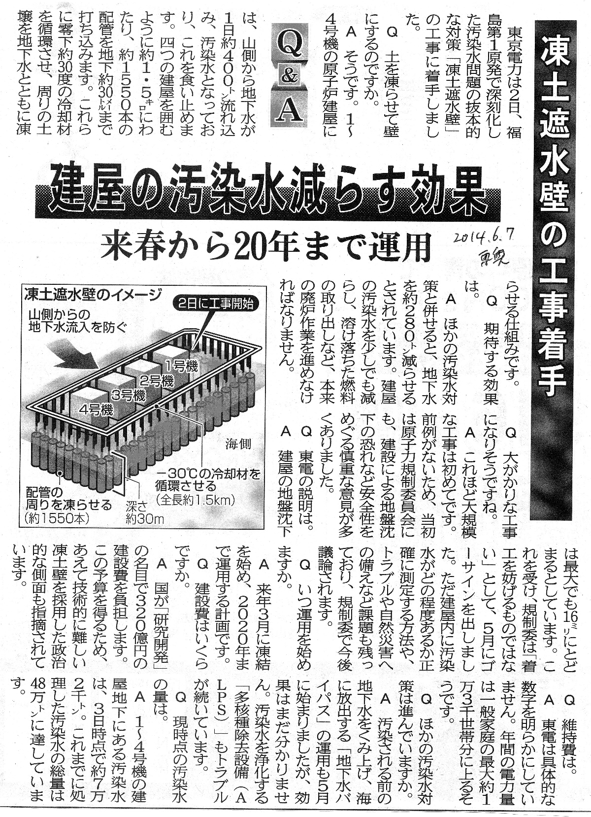 | [2014_06_07_03]凍土遮水壁の工事着手 建屋の汚染水減らす効果 来春から20年まで運用(東奥日報2014年6月7日) |