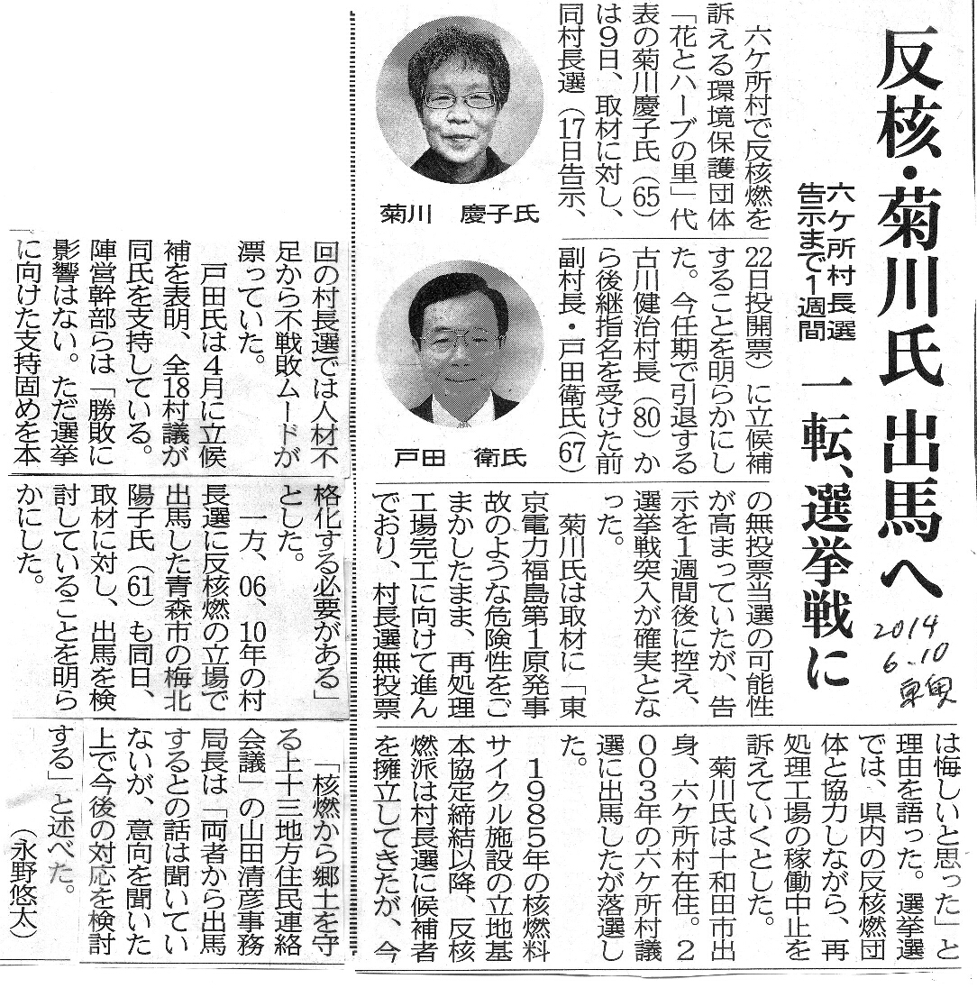 | [2014_06_10_01]反核・菊川氏 出馬へ 六ヶ所村長選 告示まで1週間 一転、選挙戦に(東奥日報2014年6月10日) |