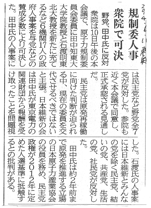 [2014_06_11_01]規制委人事 衆院で可決 野党、田中氏に反対(東奥日報2014年6月11日)