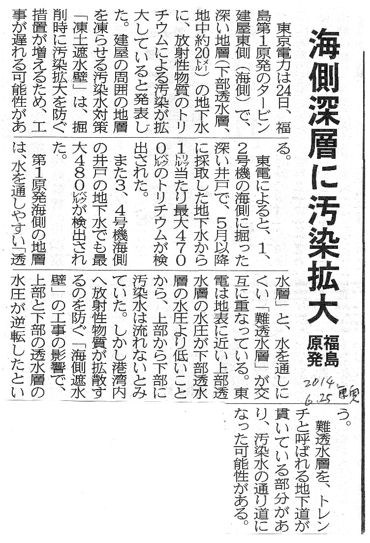 [2014_06_25_01]海側深層に汚染拡大 福島原発(東奥日報2014年6月25日)
