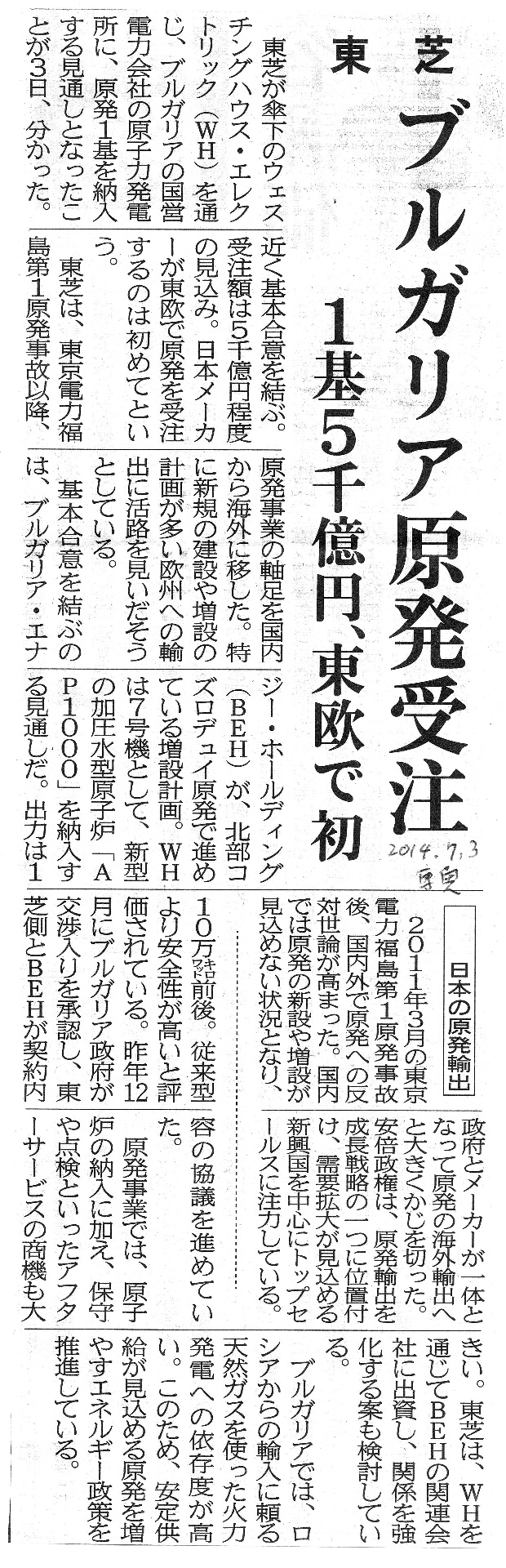 [2014_07_03_02]東芝 ブルガリア原発受注 1基5千億円、東欧で初(東奥日報2014年7月3日)
