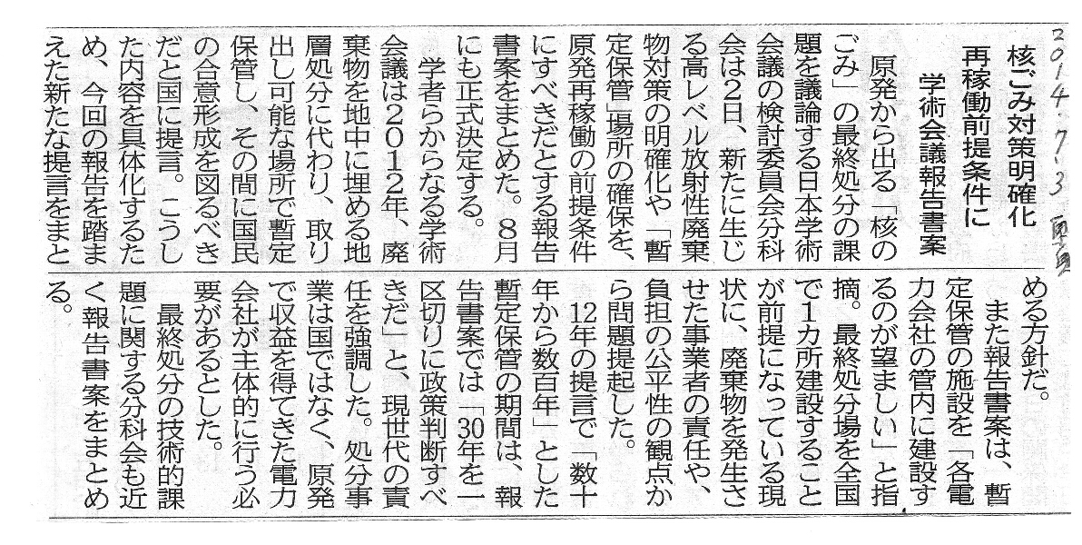 [2014_07_03_03]核ごみ対策明確化 再稼働前提条件に 学術会議報告書案(東奥日報2014年7月3日)