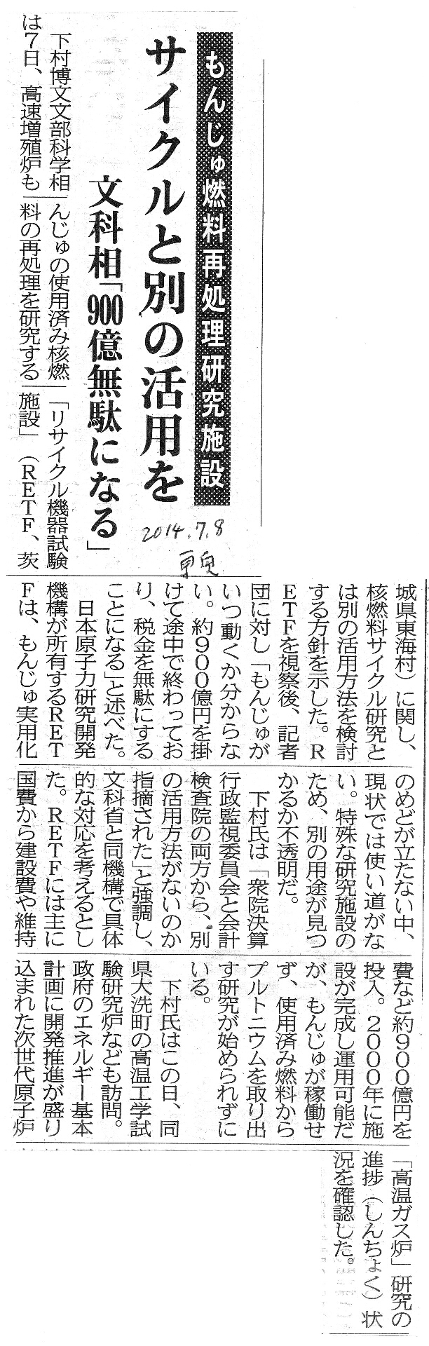 [2014_07_08_02]もんじゅ燃料再処理研究施設 サイクルと別の活用を 文科相「900億無駄になる」(東奥日報2014年7月8日)