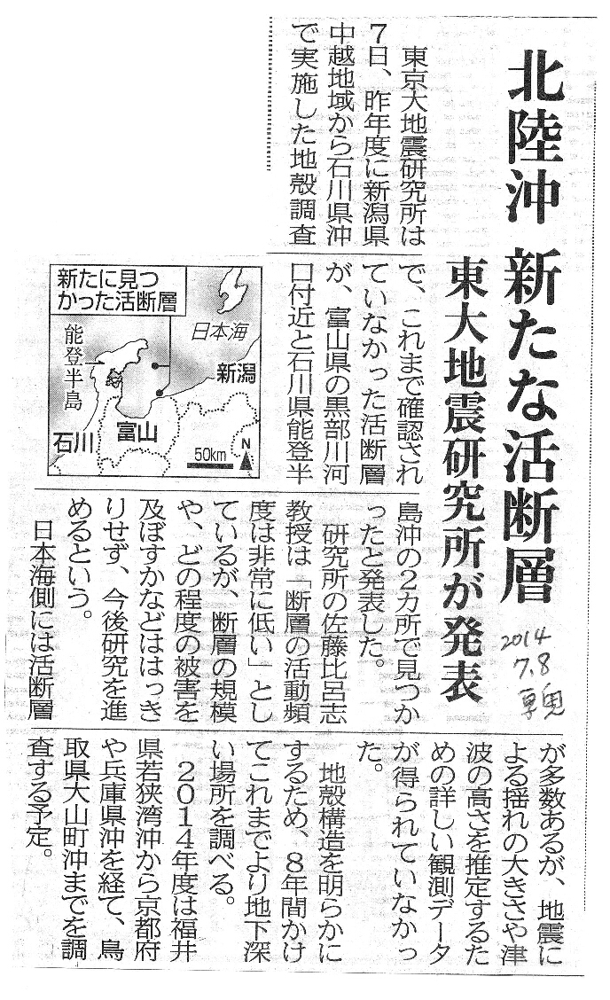 | [2014_07_08_05]北陸沖 新たな活断層 東大地震研究所が発表(東奥日報2014年7月8日) |