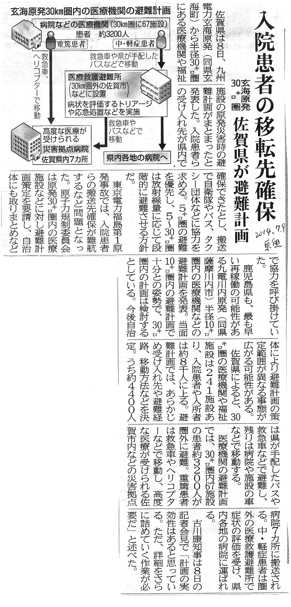 [2014_07_09_01]入院患者の移転先確保 玄海原発30キロ圏 佐賀県が避難計画(東奥日報2014年7月9日)