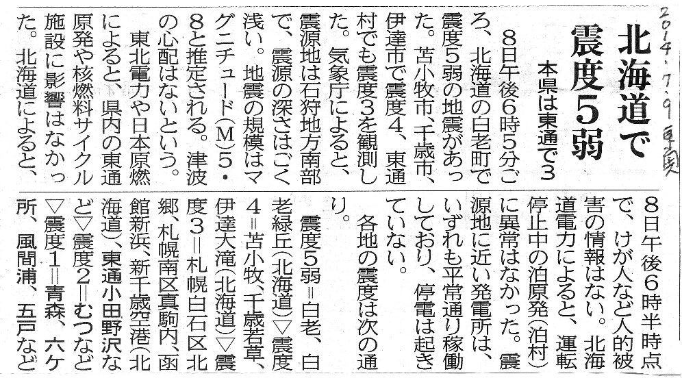 [2014_07_09_03]北海道で震度5弱 本県は東通で3(東奥日報2014年7月9日)