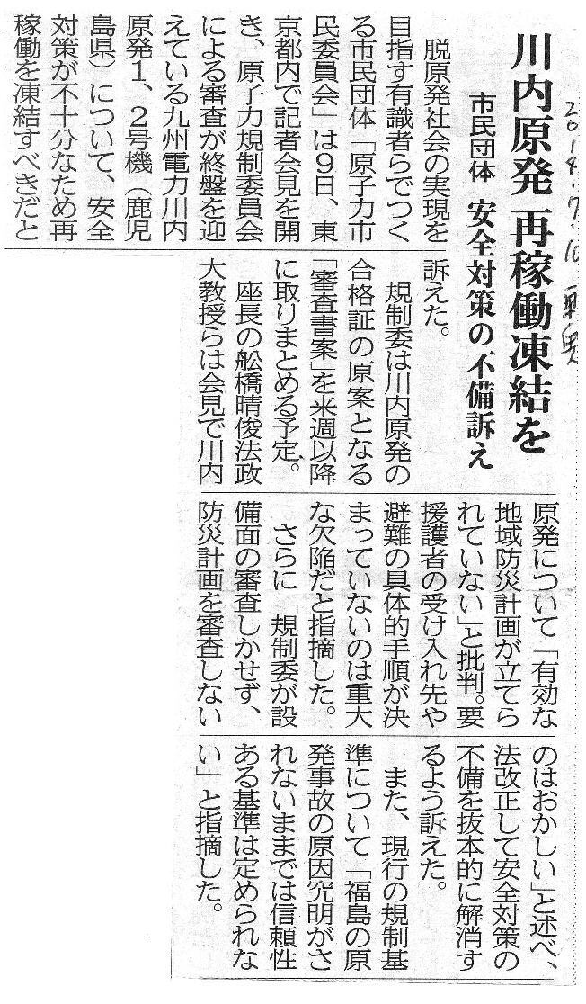 [2014_07_16_18]川内原発 再稼働凍結を 市民団体 安全対策の不備訴え(東奥日報2014年7月16日)