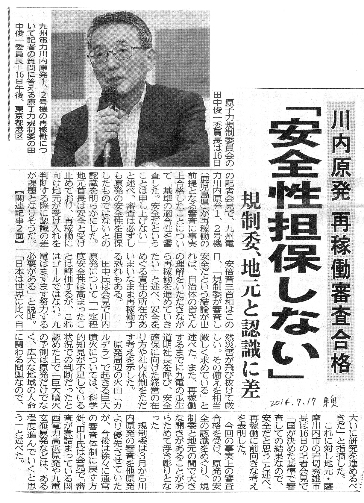 [2014_07_17_03]川内原発 再稼働審査合格 「安全性担保しない」 規制委、地元と認識に差(東奥日報2014年7月17日)