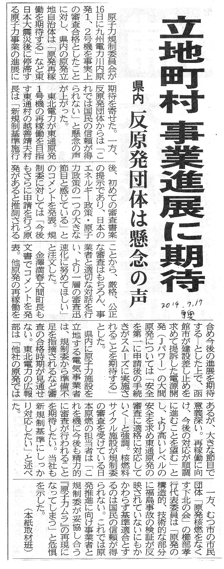 [2014_07_17_04]立地町村 事業進展に期待 県内 反原発団体は懸念の声(東奥日報2014年7月17日)