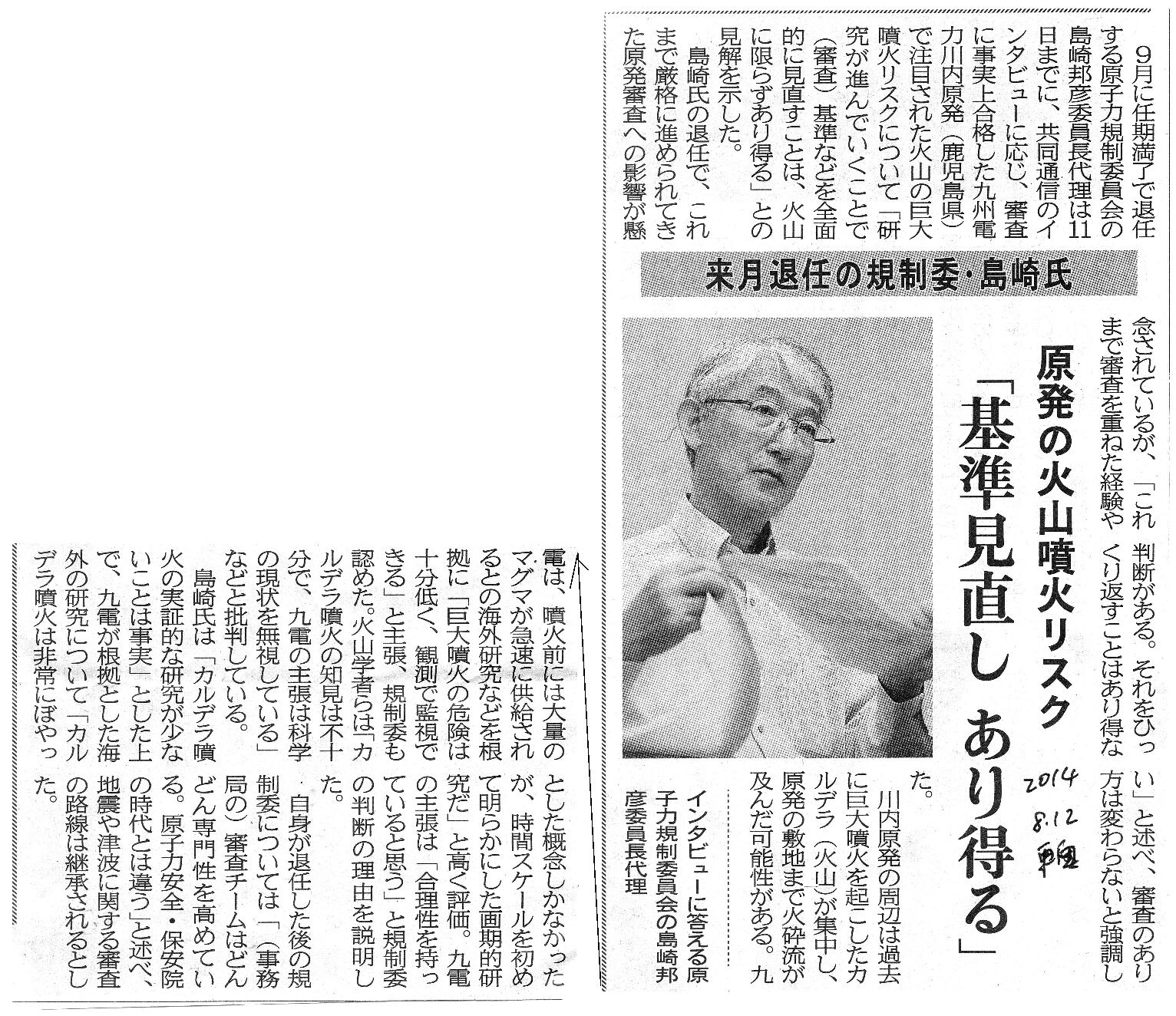 | [2014_08_12_01]来月退任の規制委・島崎氏 原発の火山噴火リスク 「基準見直し あり得る」(東奥日報2014年8月12日) |