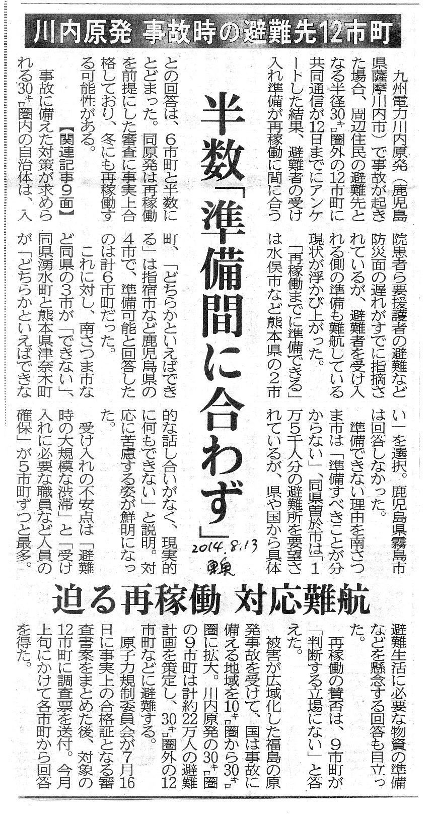 [2014_08_13_01]川内原発 事故時の避難先12市町 半数「準備間に合わず」 迫る再稼働 対応難航(東奥日報2014年8月13日)