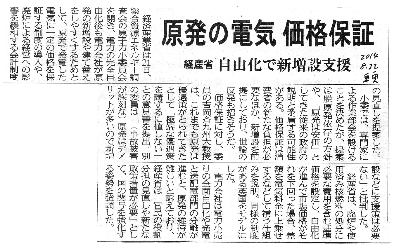 [2014_08_22_01]原発の電気 価格保証 経産省 自由化で新増設支援(東奥日報2014年8月22日)