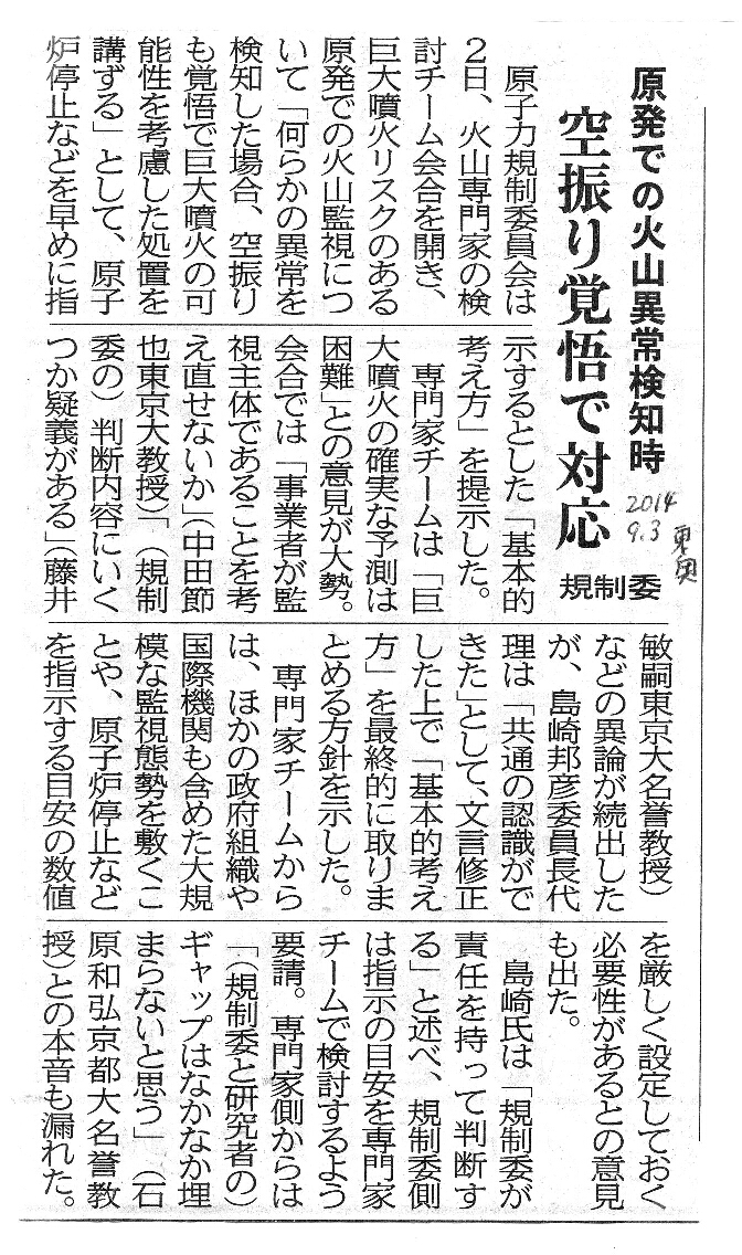 [2014_09_03_02]原発での火山異常検知時 空振り覚悟で対応 規制委(東奥日報2014年9月3日)
