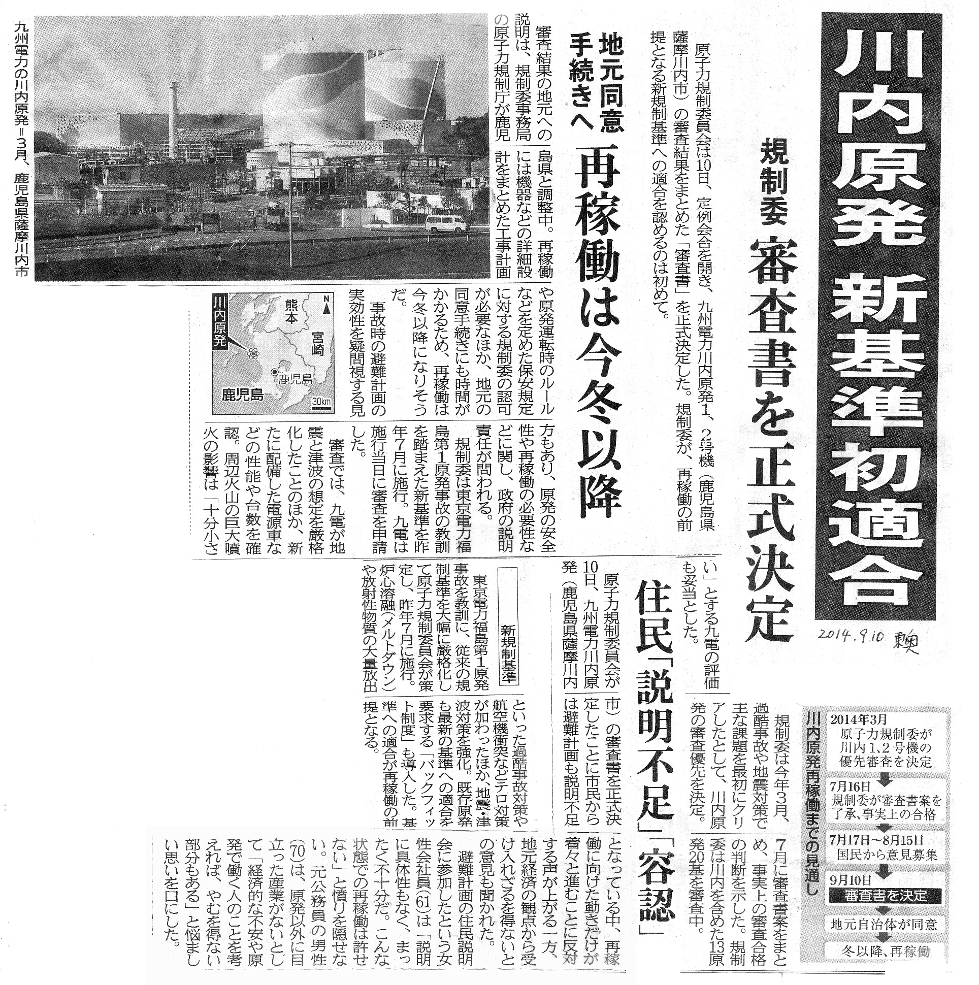 [2014_09_10_04]川内原発 新基準発適合 規制委 審査書を正式決定 地元同意手続き 再稼働は今冬以降 住民「説明不足」「容認」(東奥日報2014年9月10日)