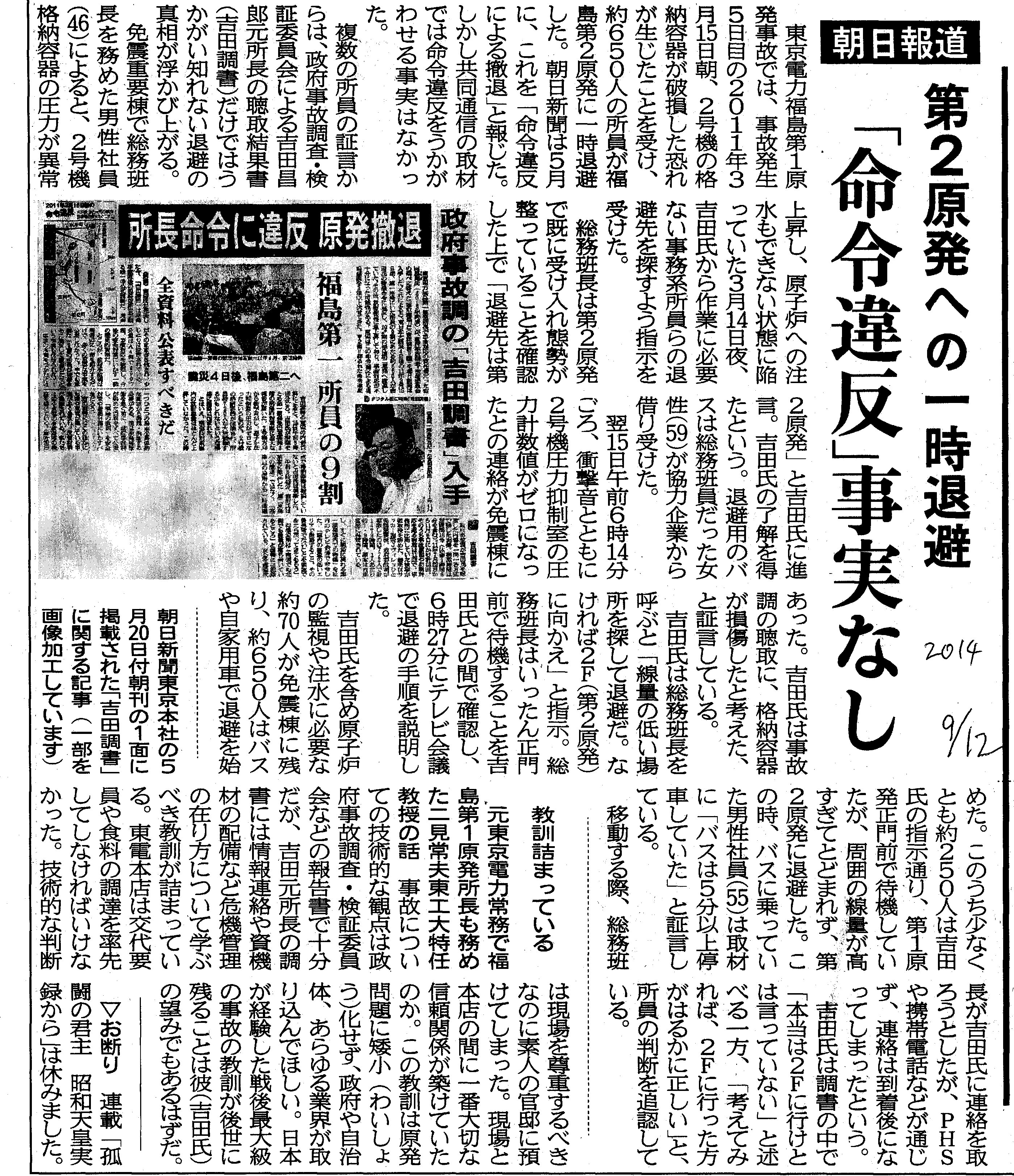[2014_09_12_05]朝日報道 第2原発への一時退避 「命令違反」事実なし(東奥日報2014年9月12日)