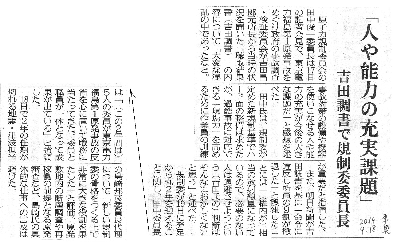 [2014_09_18_02]「人や能力の充実課題」 吉田調書で規制委委員長(東奥日報2014年9月18日)