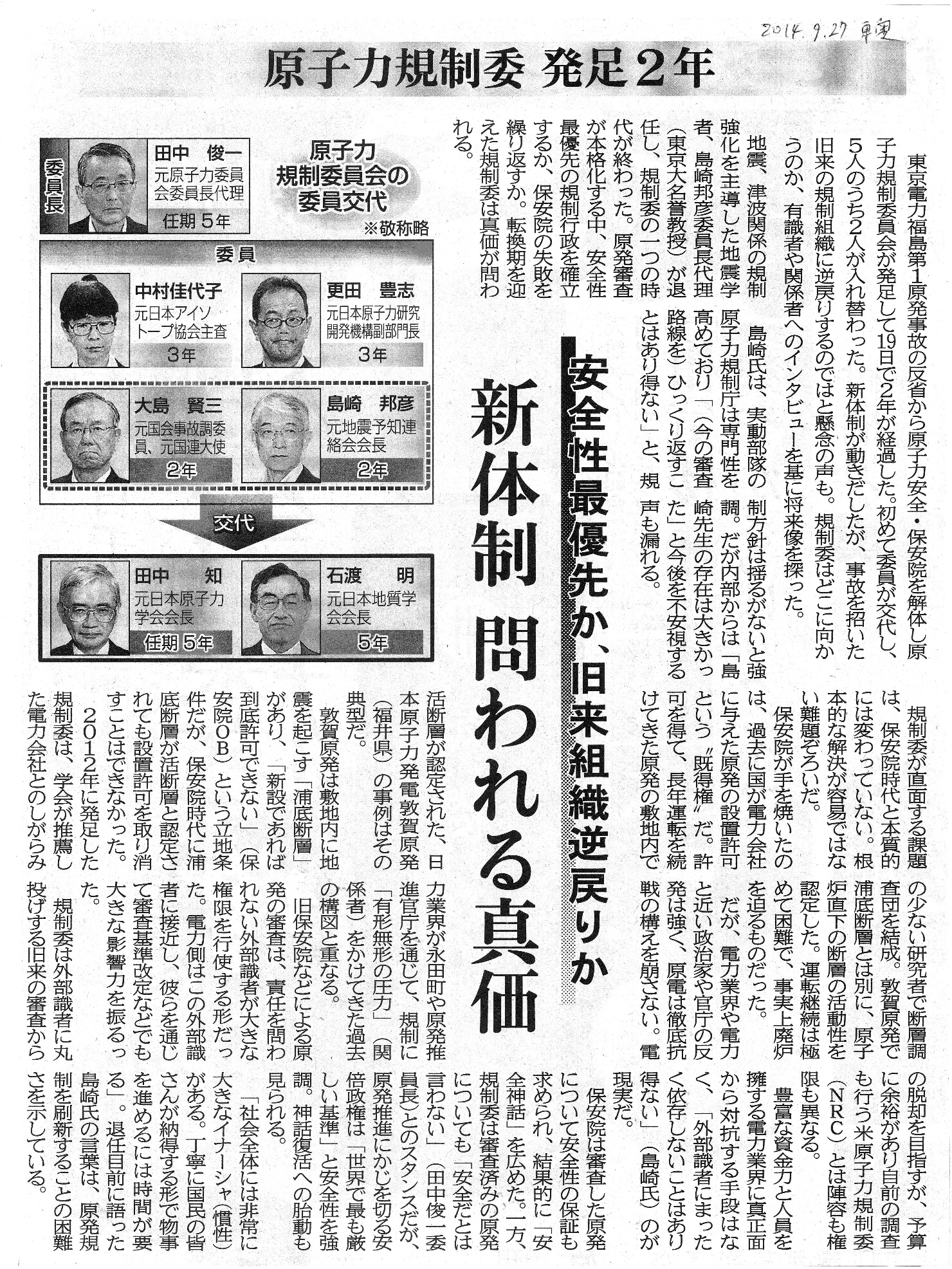 | [2014_09_27_02]原子力規制委発足2年 安全性最優先か、旧来組織逆戻りか 新体制 問われる真価(東奥日報2014年9月27日) |