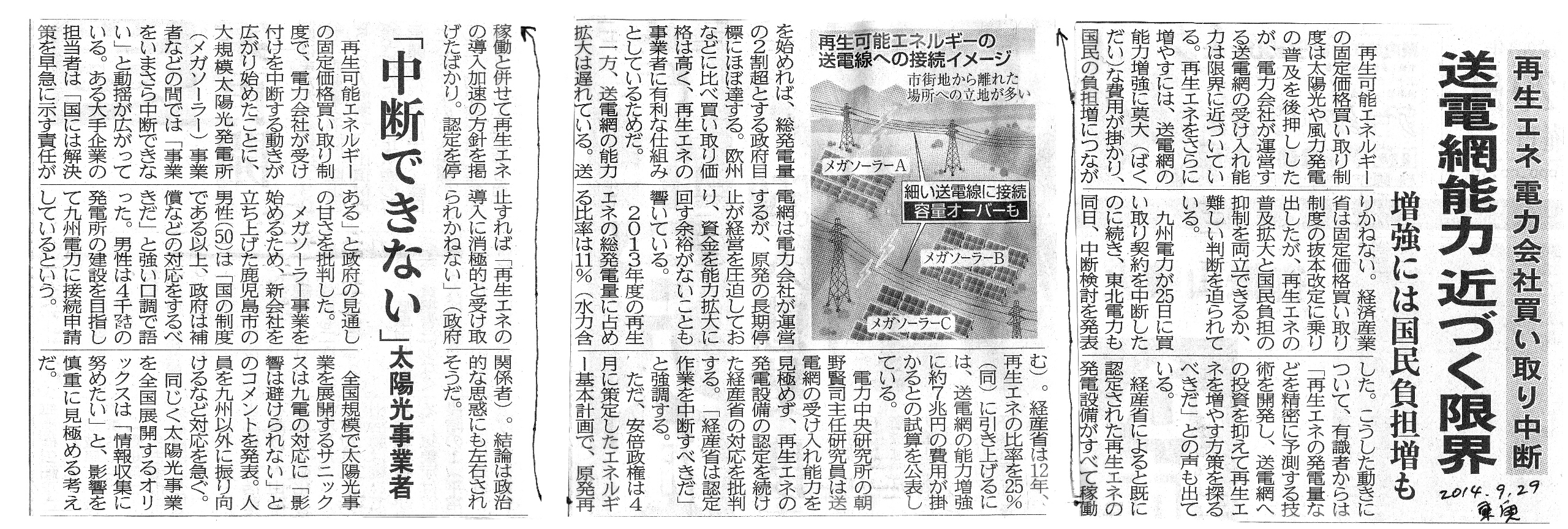 [2014_09_29_02]再生エネ電力会社買い取り中断 送電網能力 近づく限界 増強には国民負担増も(東奥日報2014年9月29日)
