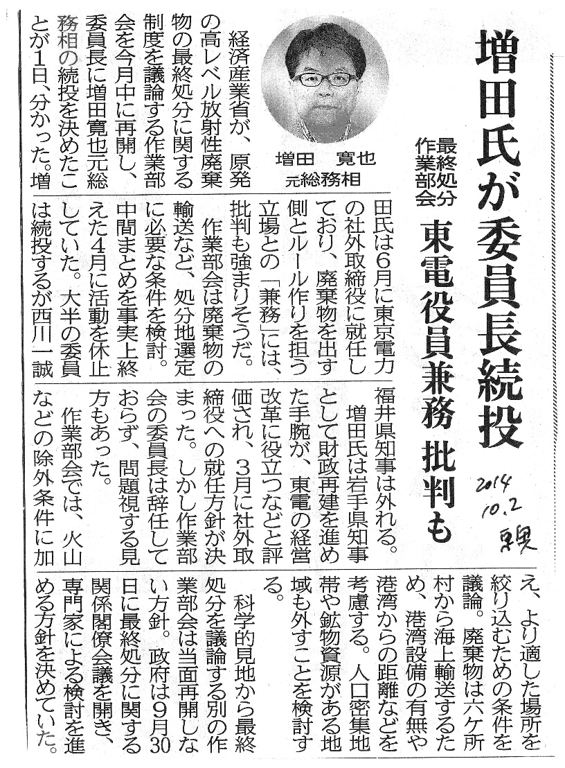 [2014_10_02_01]増田氏が委員長続投 最終処分作業部会 東電役員兼務 批判も(東奥日報2014年10月2日)