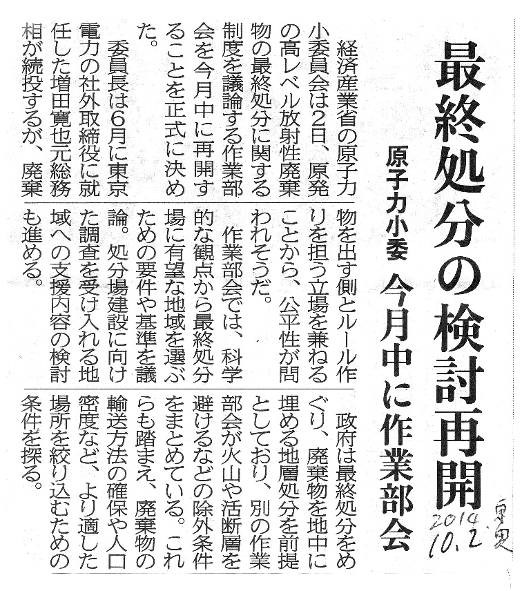 [2014_10_02_02]最終処分の検討再開 原子力小委 今月中に作業部会(東奥日報2014年10月2日)