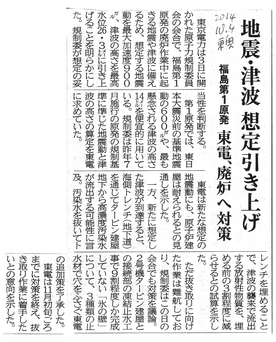 | [2014_10_04_02]地震・津波 想定引き上げ 福島第1原発 東電、廃炉へ対策(東奥日報2014年10月4日) |