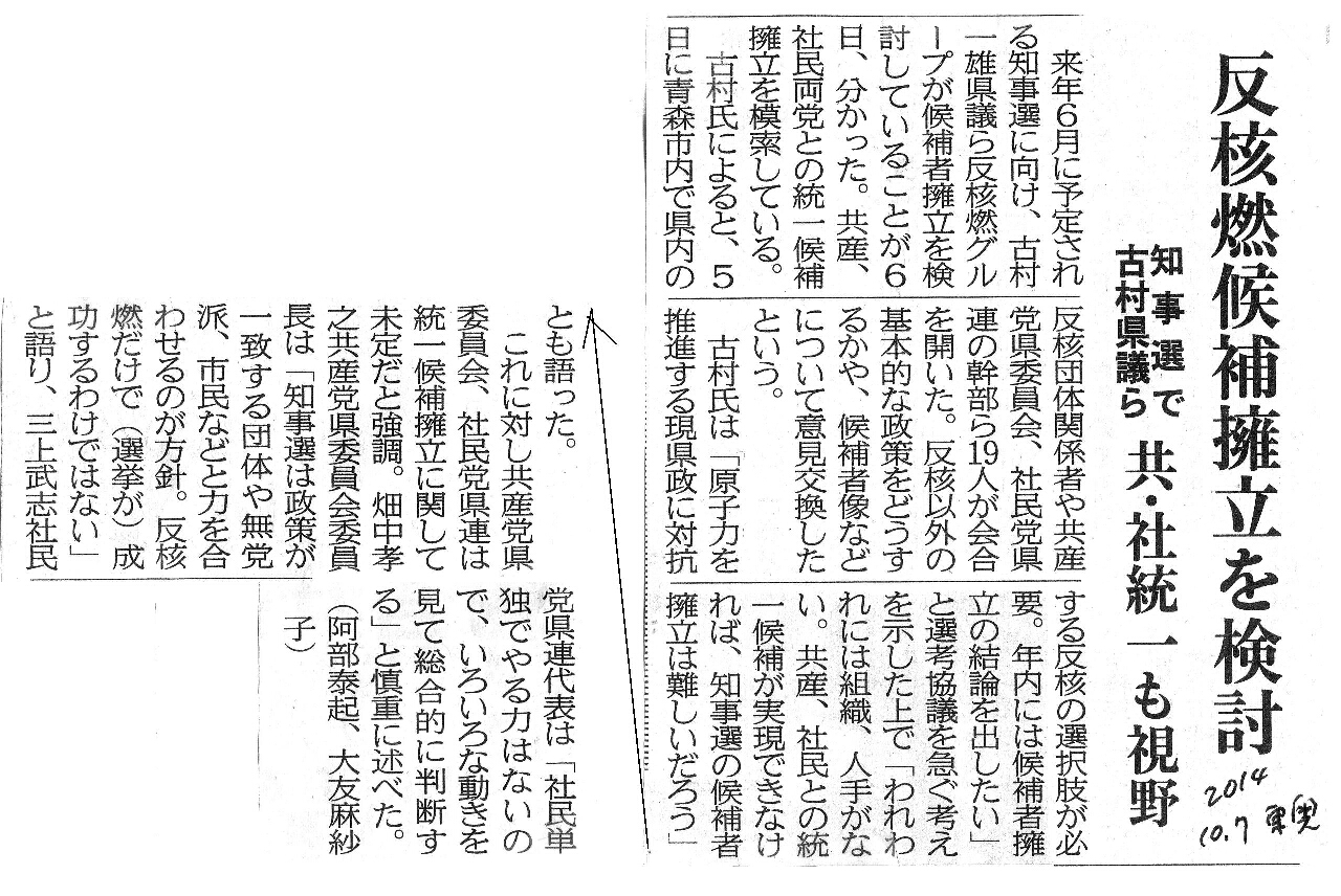 [2014_10_07_02]反核燃候補擁立を検討 知事選で古村県議ら 共・社統一も視野(東奥日報2014年10月7日)
