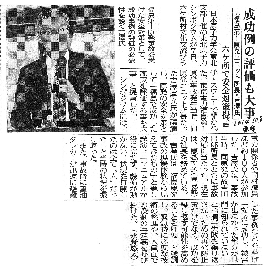 | [2014_10_08_01]成功例の評価も大事 元福島第1原発ユニット所長・吉澤氏 六ヶ所で安全対策提言(東奥日報2014年10月8日) |