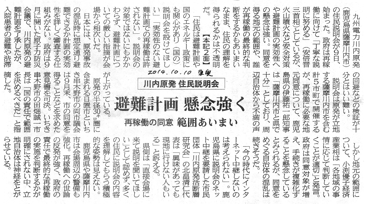 [2014_10_10_05]川内原発 住民説明会 避難計画 懸念強く 再稼働の同意 範囲あいまい(東奥日報2014年10月10日)