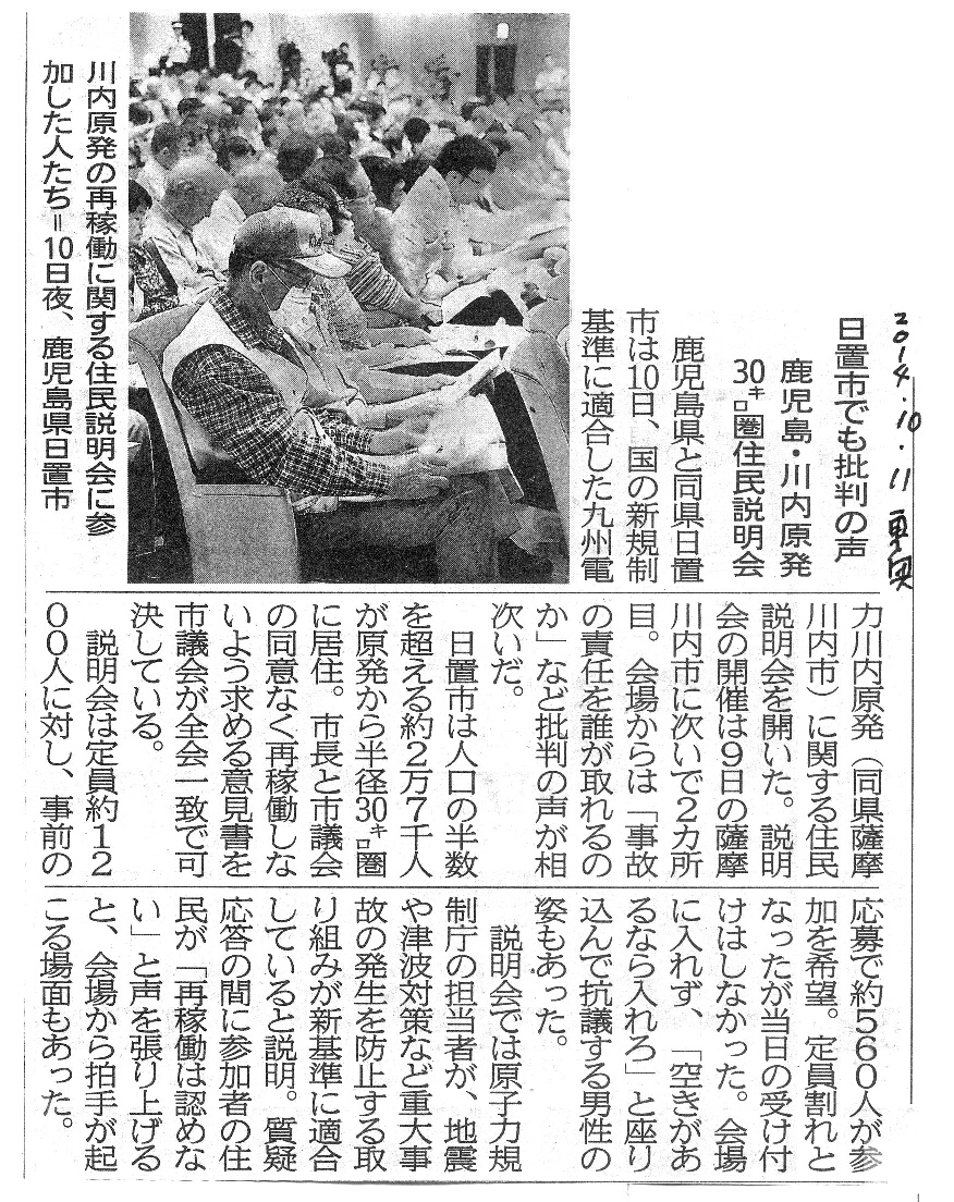 [2014_10_11_01]日置市でも批判の声 鹿児島・川内原発 30キロ圏住民説明会(東奥日報2014年10月11日)
