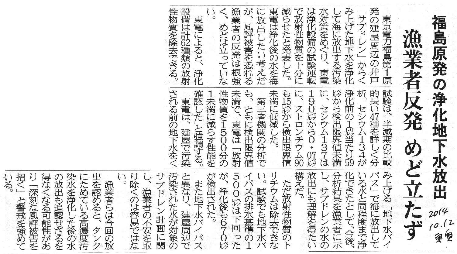 | [2014_10_12_02]福島原発の浄化地下水放出 漁業者反発 めど立たず(東奥日報2014年10月12日) |