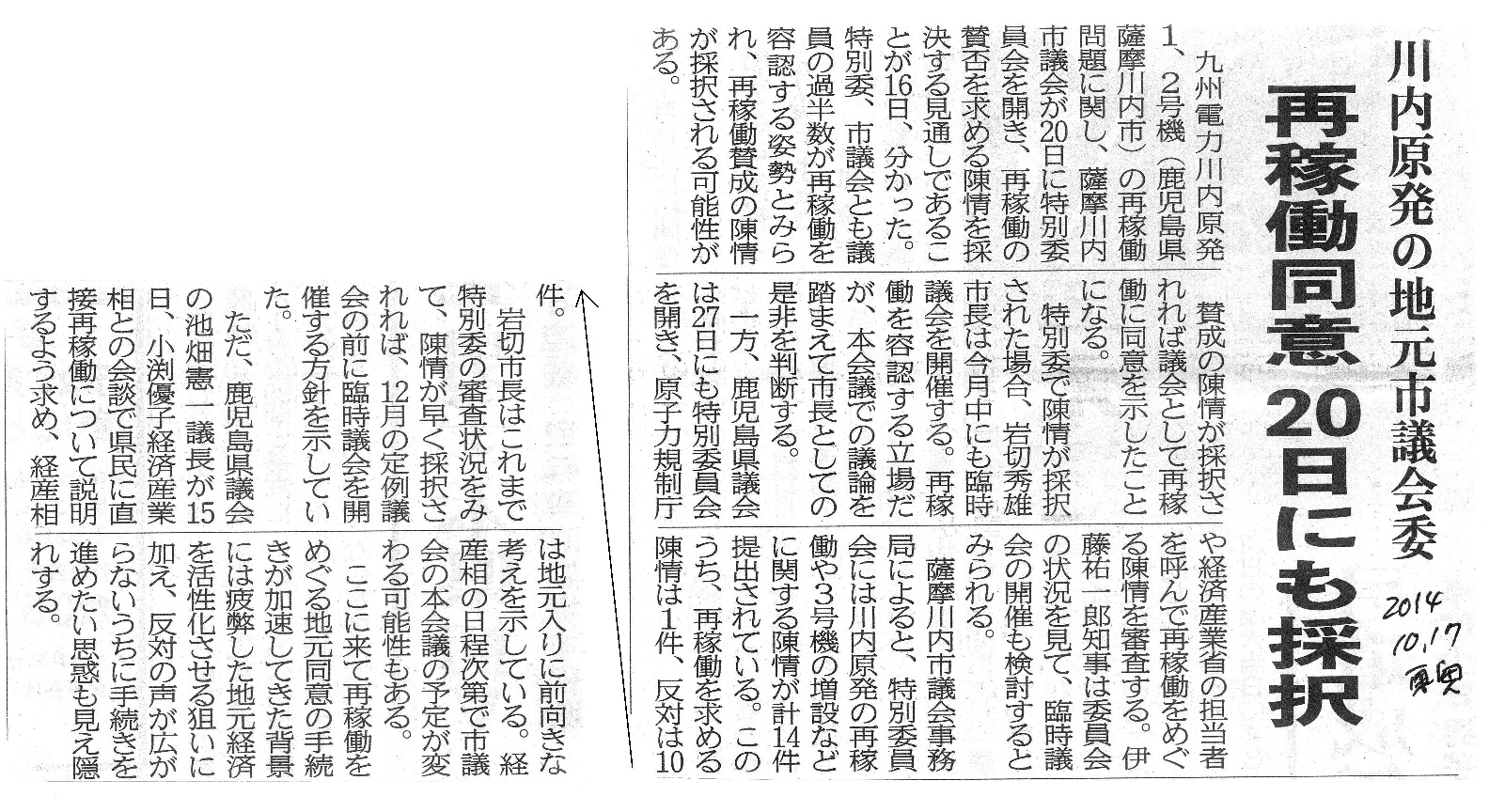 [2014_10_17_01]川内原発の地元市議会案 再稼働同意 20日も採択(東奥日報2014年10月17日)