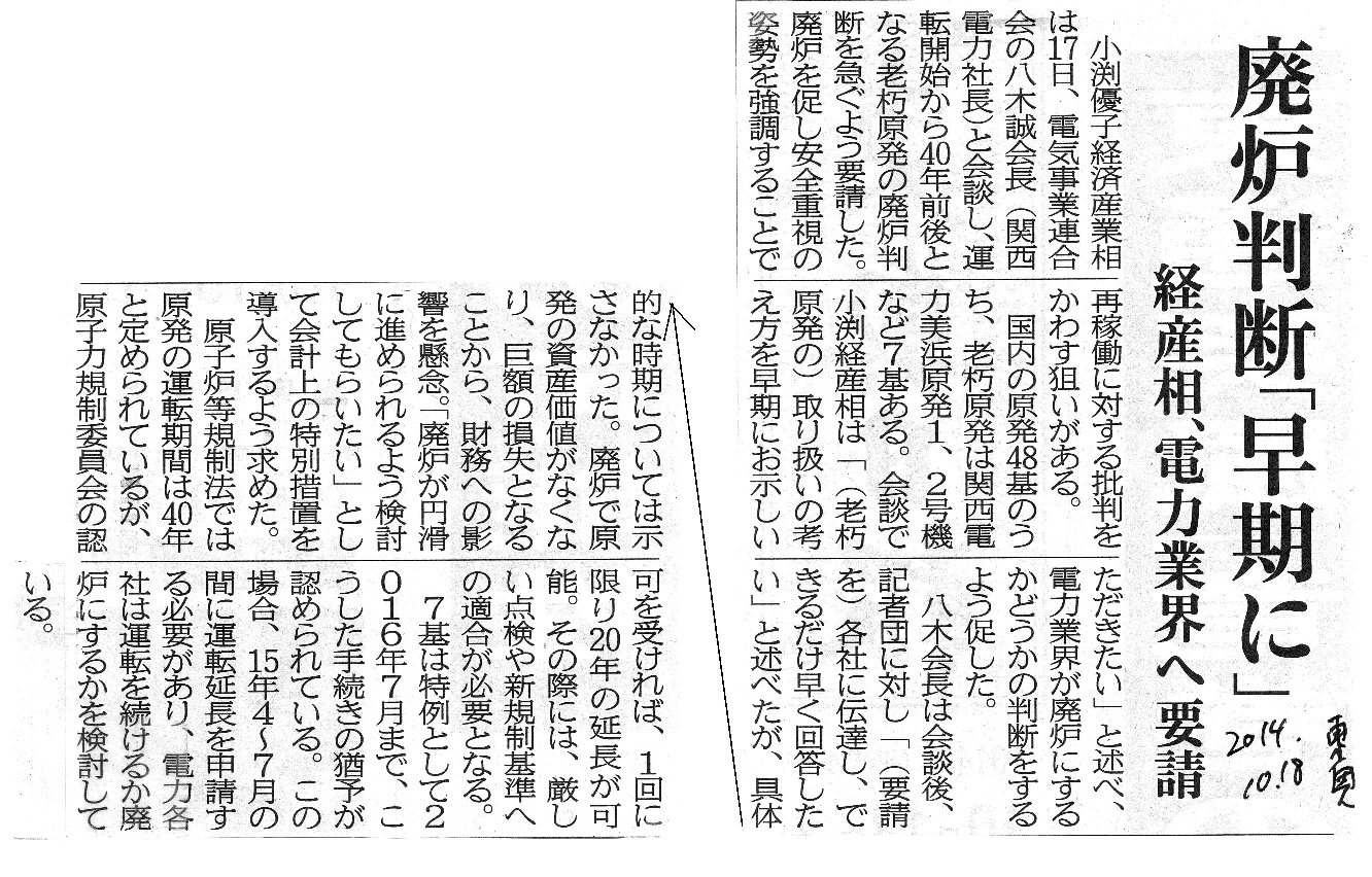 | [2014_10_18_02]廃炉判断「早期に」 経産相、電力業界へ要請(東奥日報2014年10月18日) |
