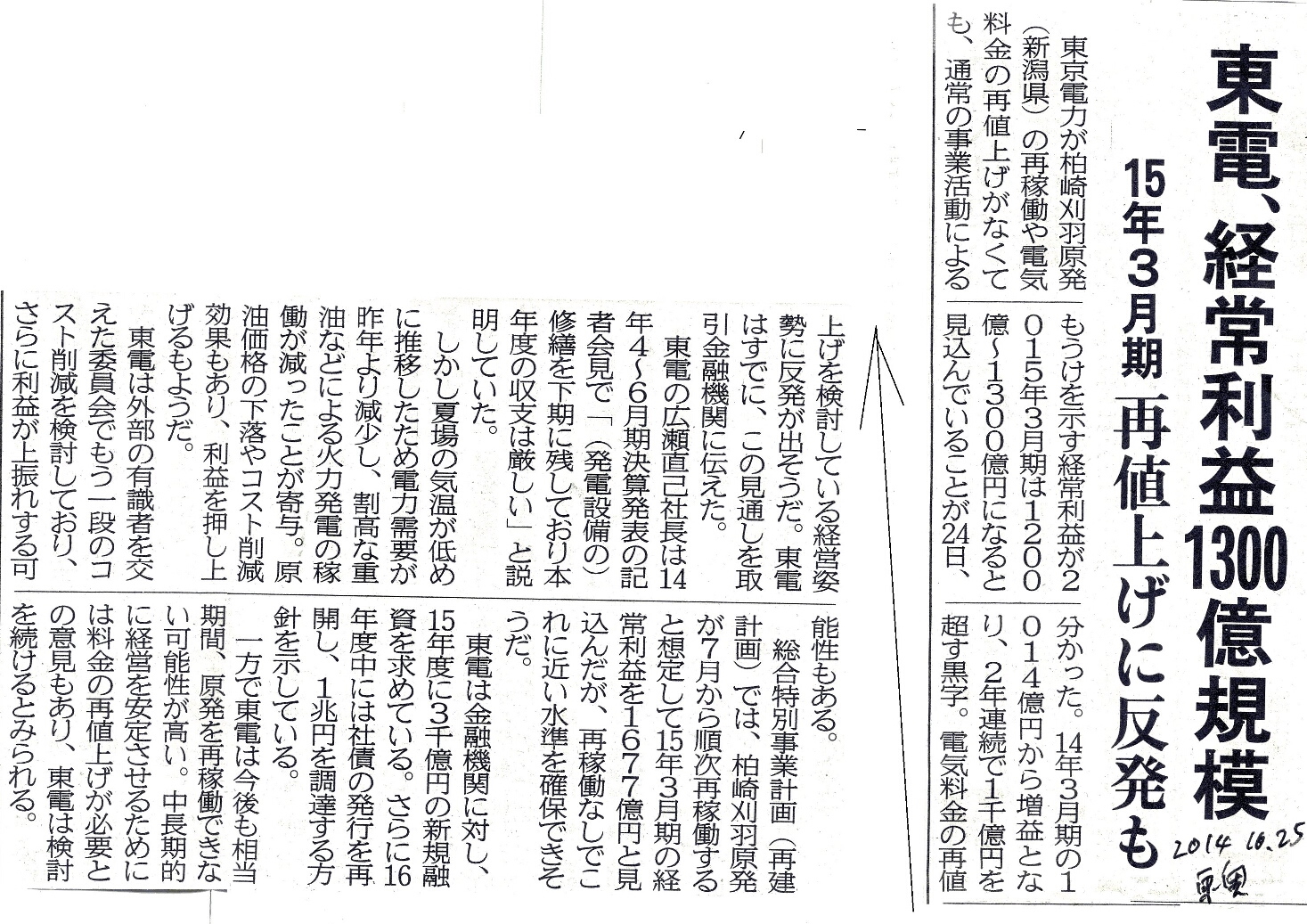 [2014_10_25_02]東電、経常利益1300億程度 15年3月期 再値上げに反発も(東奥日報2014年10月25日)