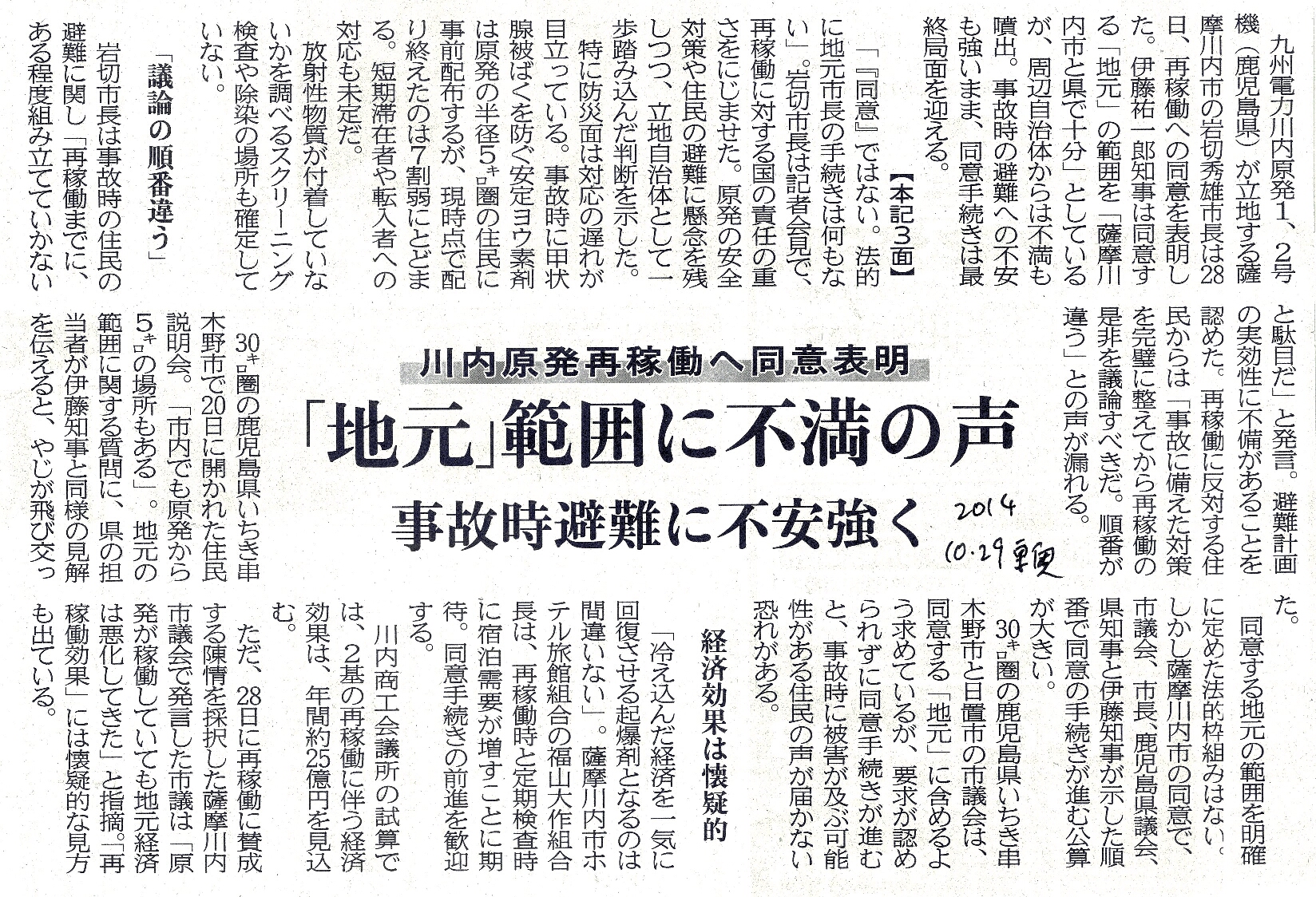 [2014_10_29_01]川内原発再稼働へ同意表明 「地元」範囲に不満の声 事故時避難に不安強く 「議論の順番違う」(東奥日報2014年10月29日)