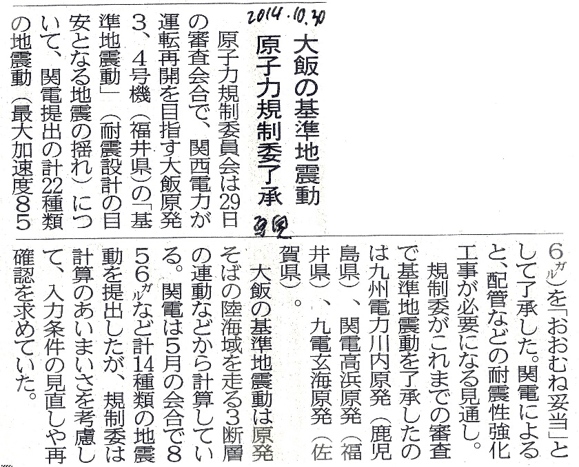 | [2014_10_30_01]大飯の基準地震動 原子力規制委了承(東奥日報2014年10月30日) |