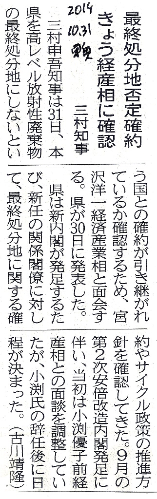[2014_10_31_03]最終処分地否定確約 きょう経産相に確認 三村知事(東奥日報2014年10月31日)