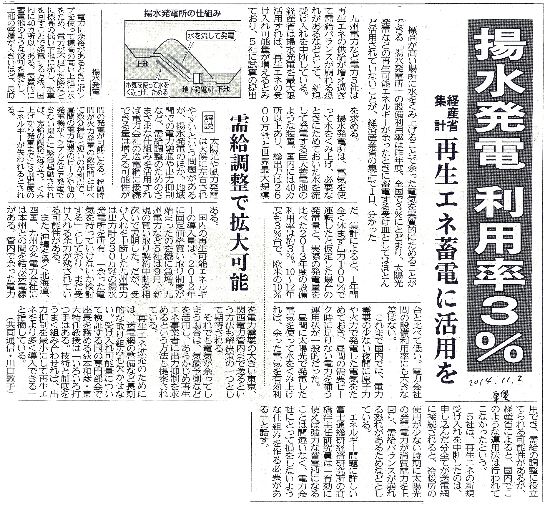 [2014_11_02_01]揚水発電 利用率3% 経産省集計 再生エネ蓄電に活用を 需給調整で拡大可能(東奥日報2014年11月2日)