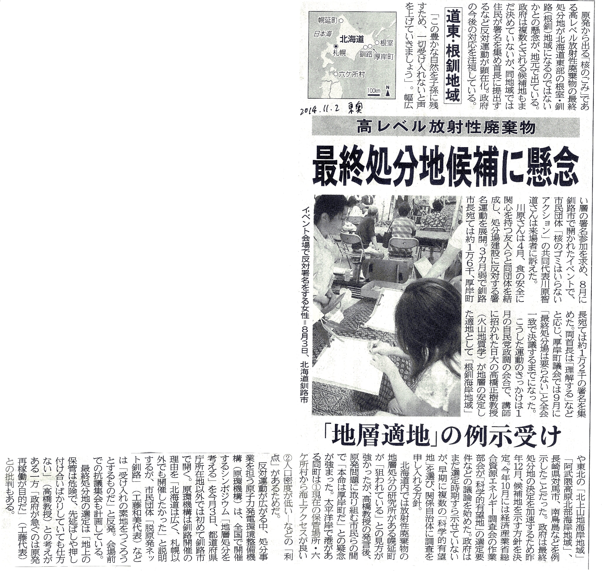 [2014_11_02_02]道東・根釧地域 高レベル放射性廃棄物 最終処分地候補に懸念 「地層適否」の例示受け(東奥日報2014年11月2日)
