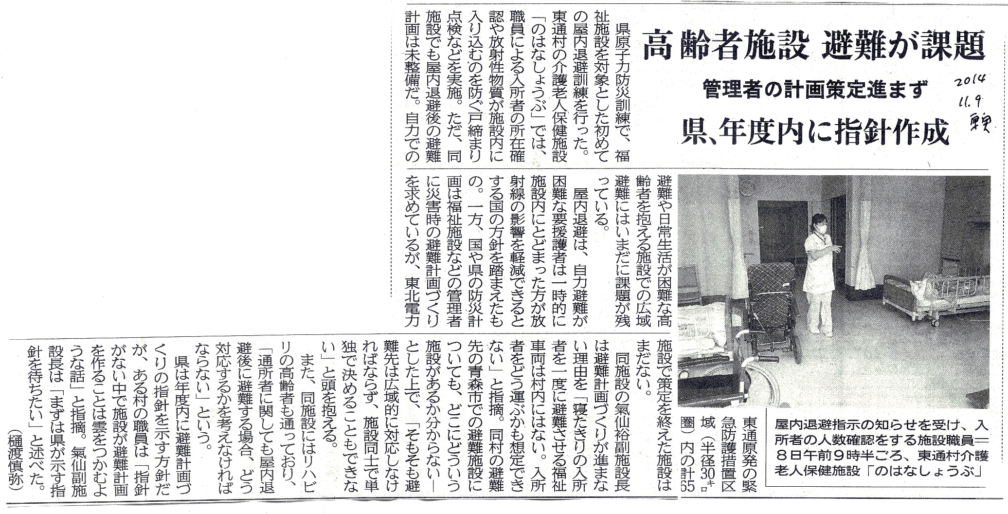 | [2014_11_09_01]高齢者施設 避難が課題 管理者の計画策定進まず 県、年度内に指針説明(東奥日報2014年11月9日) |