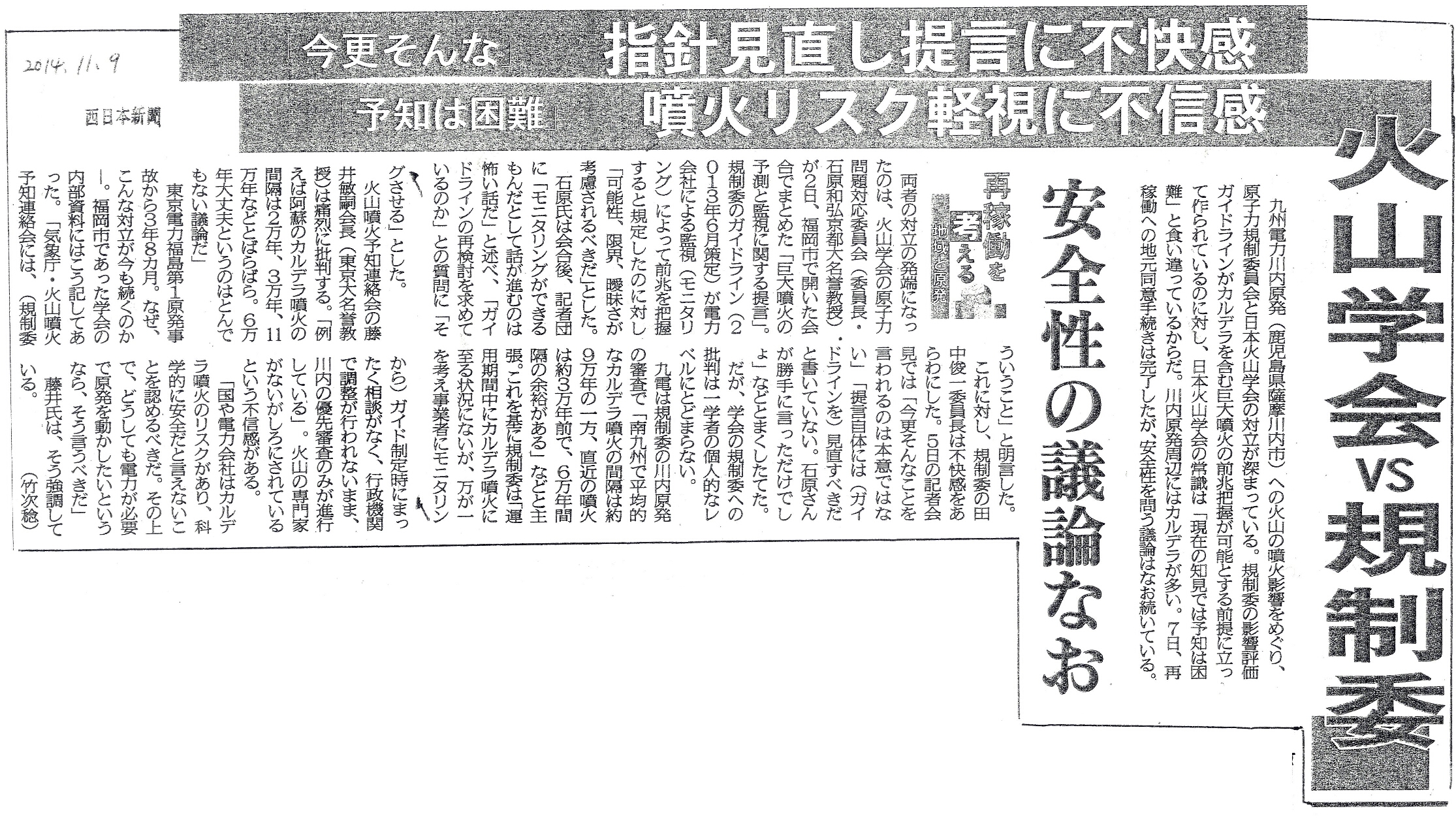 [2014_11_09_02]火山学会VS規制委 今更そんな 指針見直し提言に不快感 予知は困難 噴火リスク軽視に不信感 安全性の議論なお 地域と原発 再稼働を考える(西日本新聞2014年11月9日)