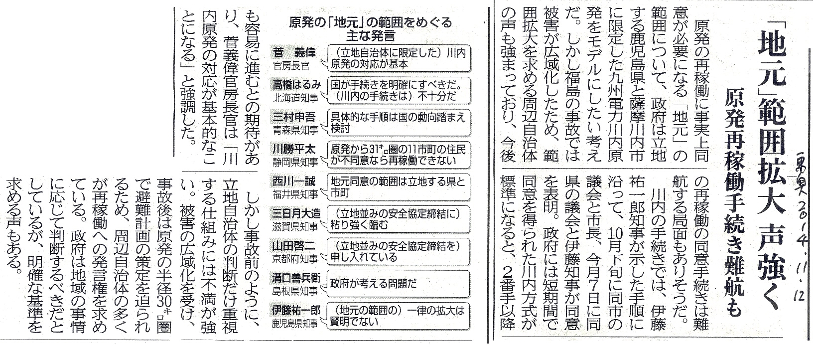[2014_11_12_02]「地元」範囲拡大 声強く 原発再稼働手続き難航も(東奥日報2014年11月12日)