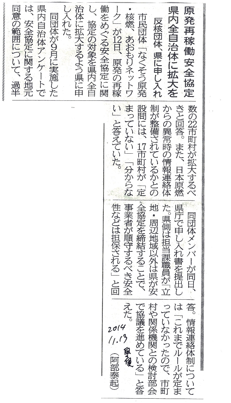 | [2014_11_13_01]原発再稼働安全協定 県内自治体に拡大を 反核団体、県に申し入れ(東奥日報2014年11月13日) |