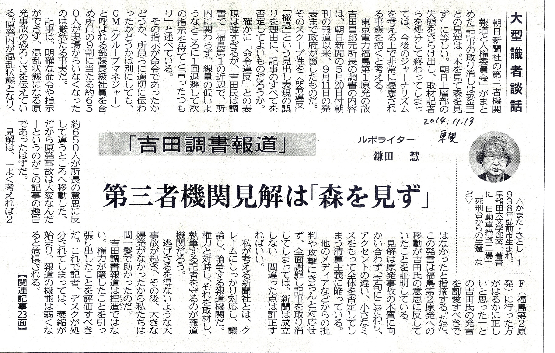 [2014_11_13_02]大型識者談話 ルポライター 鎌田慧 「吉田調書報道」 第三者機関見解は「森を見ず」(東奥日報2014年11月13日)