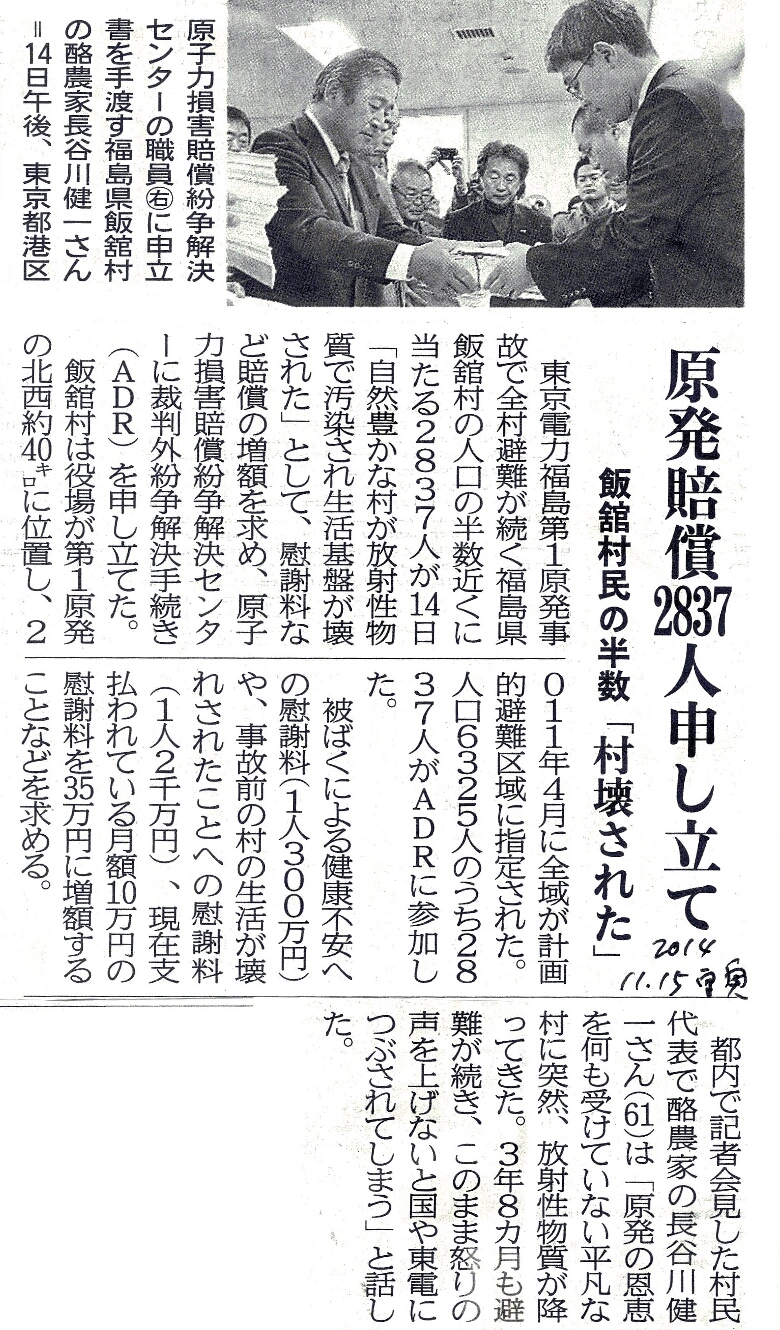 [2014_11_15_02]原発賠償2837人申し立て 飯館村の半数 「村壊された」(東奥日報2014年11月15日)
