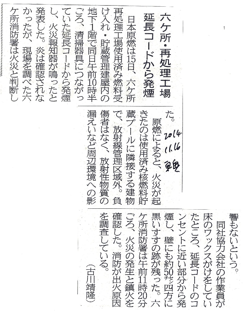 | [2014_11_16_01]六ヶ所・再処理工場 延長コードから発煙(東奥日報2014年11月16日) |