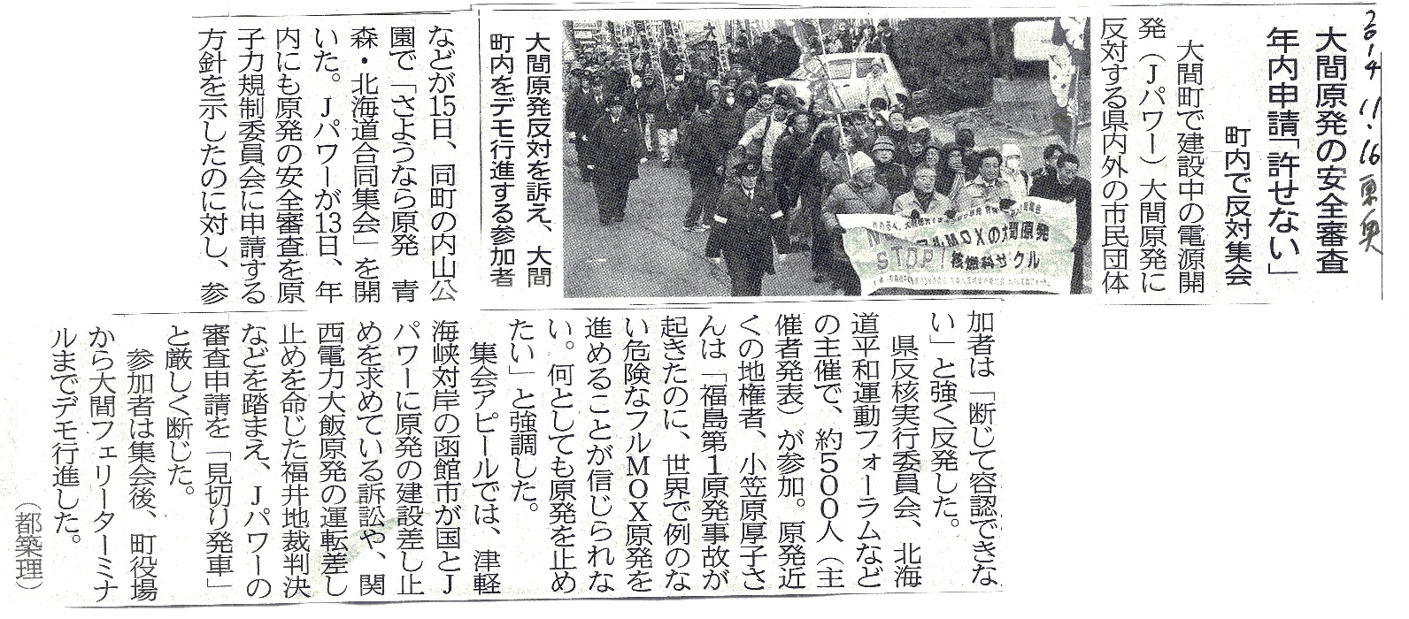 | [2014_11_16_02]大間原発の安全審査 年内申請 「許せない」(東奥日報2014年11月16日) |