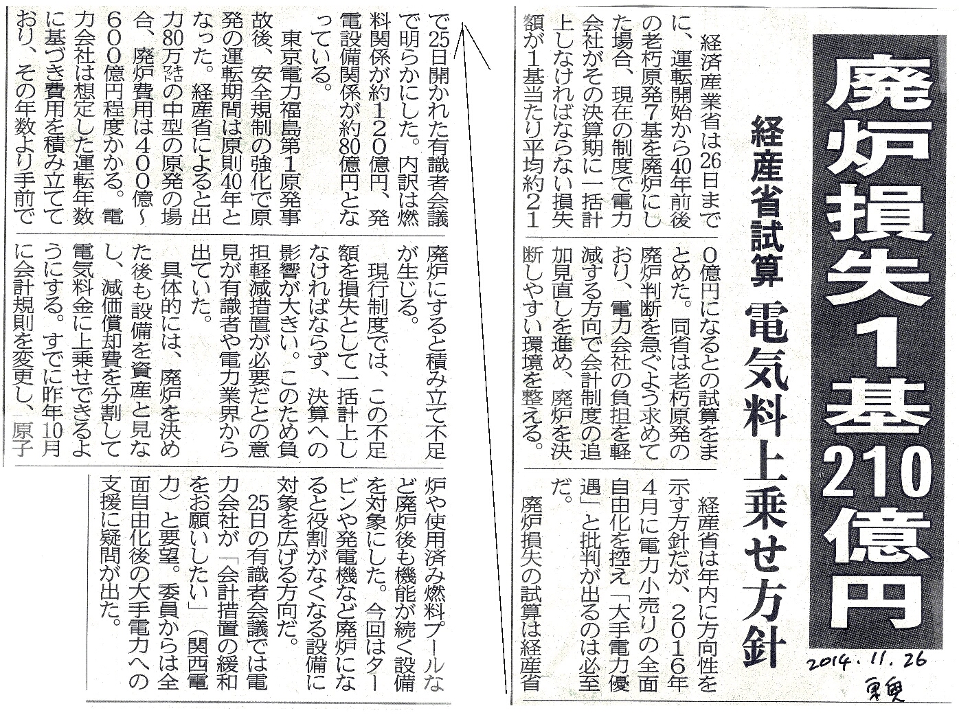 [2014_11_20_01]廃炉損失一基210億円 経産省試算 電気料上乗せ方針(東奥日報2014年11月20日)